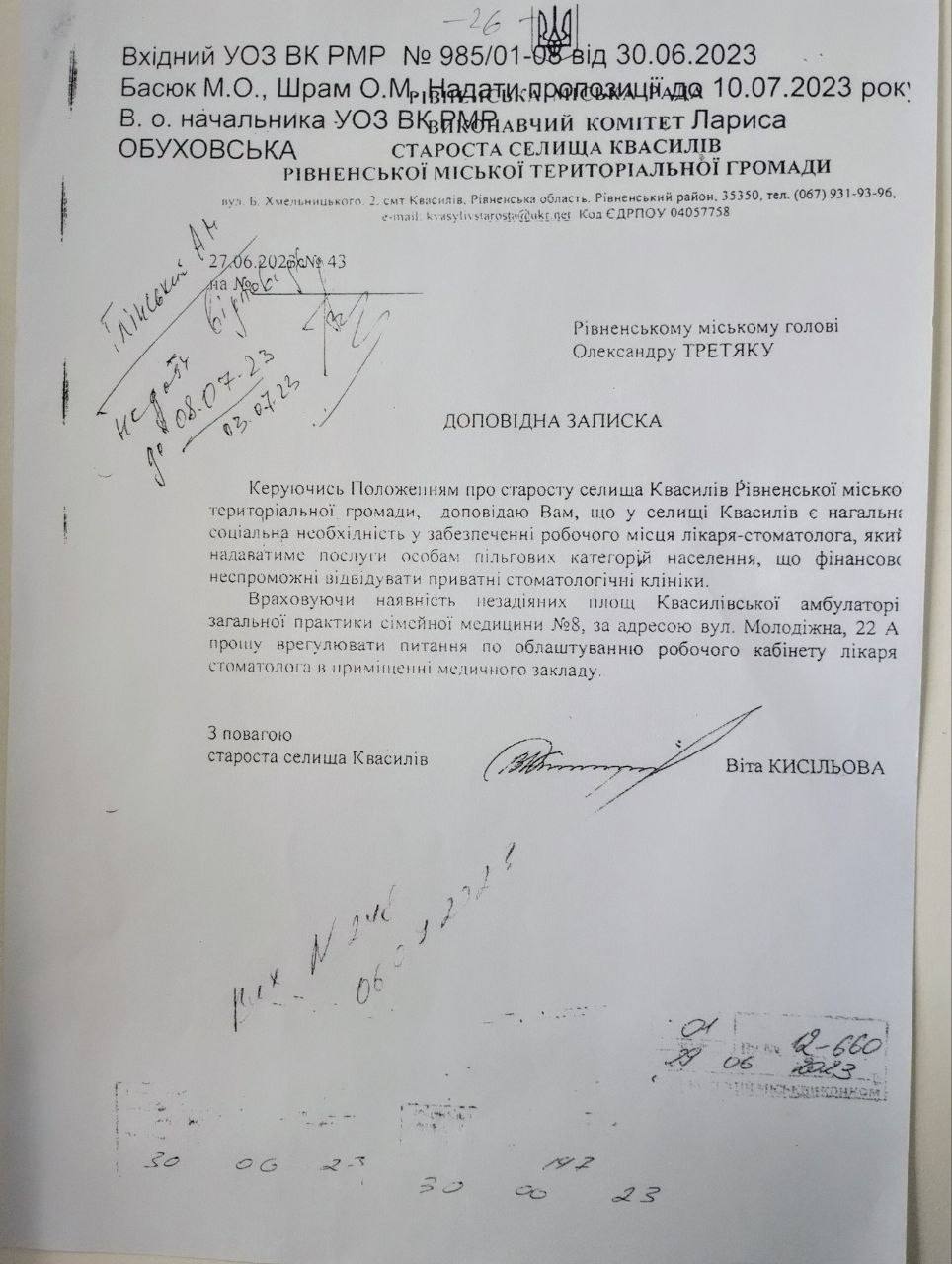 Ще один «аргумент» правоохоронців – що стоматологи у Квасилові, буцімто, не надавали безоплатних послуг населенню, а займалися приватною практикою. Жодних доказів цьому в слідства, знову, таки, немає. Натомість, є докази зворотнього: за два з половиною роки роботи, відколи лікарі вже числилися у рівненській поліклініці, ані до закладу, ані до управління охорони здоров’я не надходило жодної скарги на відмову у наданні безоплатної послуги жителям громади. А ось щойно Михайло Басюк перевів обох селищних стоматологів працювати у Рівному, де звільнилося місце, староста Квасилова надіслала звернення на ім’я міського голови Рівного про «нагальну соціальну необхідність у забезпеченні робочого місця лікаря-стоматолога, який надаватиме послуги особам пільгових категорій населення».