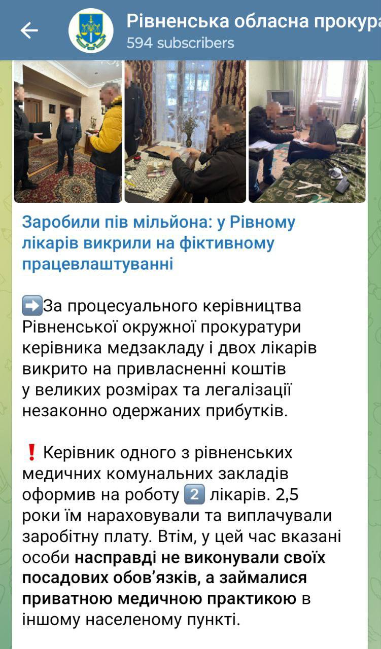 “Керівник одного з рівненських медичних комунальних закладів оформив на роботу двох лікарів. 2,5 роки їм нараховували та виплачували заробітну плату. Втім, у цей час вказані особи насправді не виконували своїх посадових обов’язків, а займалися приватною медичною практикою в іншому населеному пункті”, – ідеться в повідомленні правоохоронців.