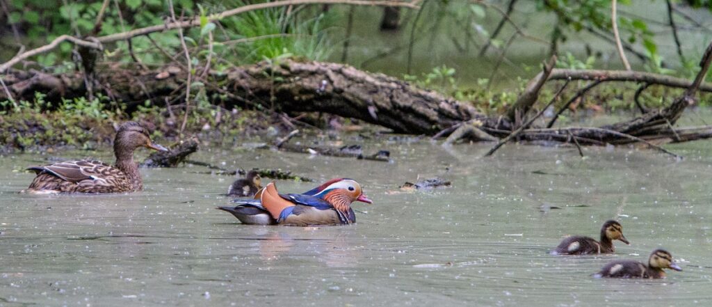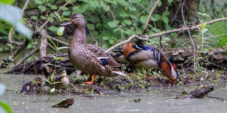 На одній з водойм Києва самець качки-мандаринки прибився до сімейства диких качок та “всиновив” маленьких каченят-крижнів.