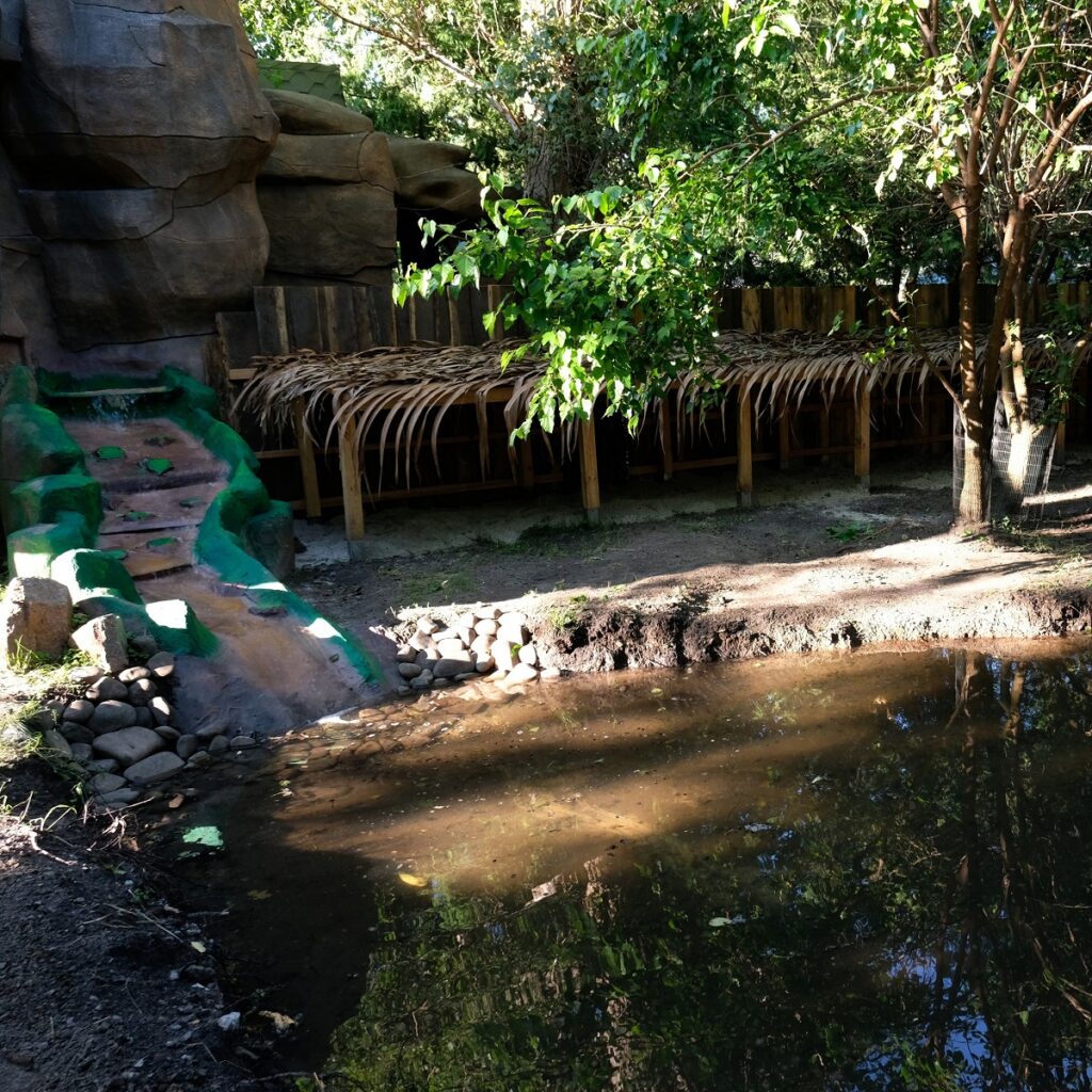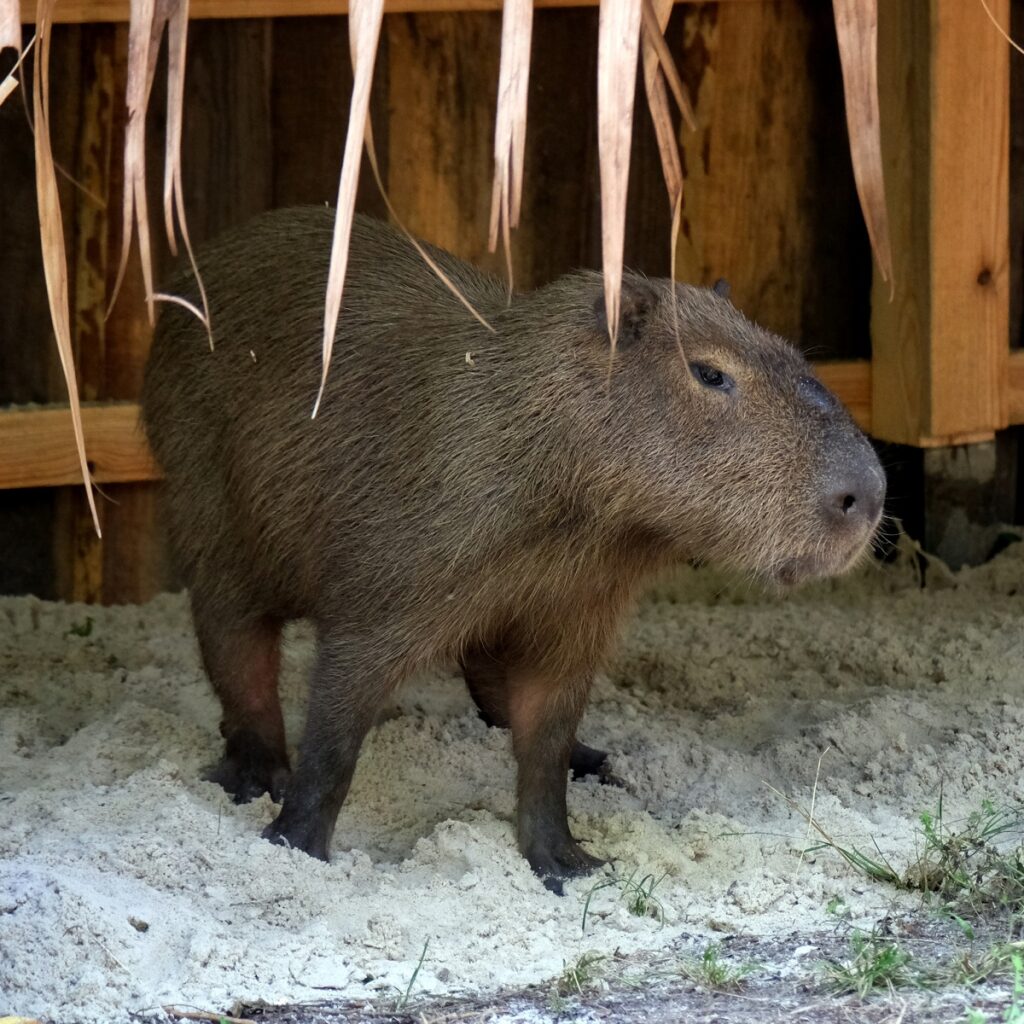 Побачити врятованого капібару можна наприкінці копитного ряду біля слоновника – у його зеленому маєтку з живими деревами, кущами та квітами на березі басейну з водограєм.