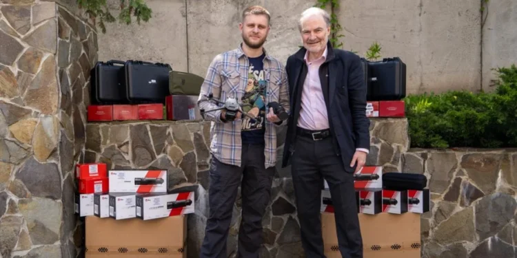 Тімоті Ґартон Еш передав дрони та нічну оптику комбату Андрію Підлісному. Фото Повернись живим