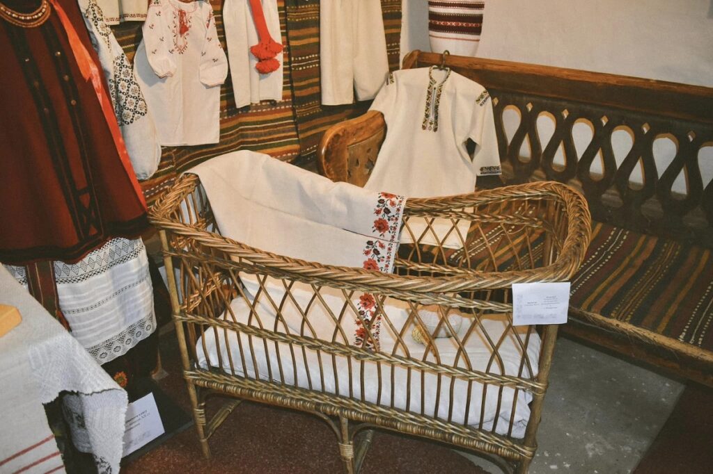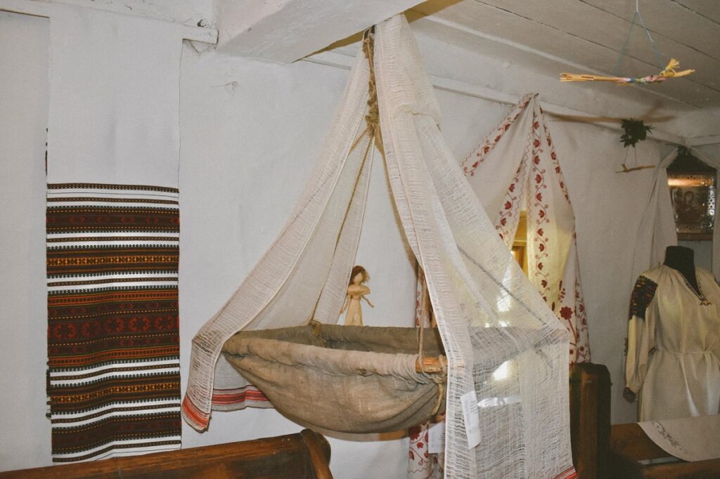 “Є тут колиски, або як їх ще називали, люльки, – польова, зшита з рядна, підвісні та стоячі, виготовлені з дерева та плетені з лози”, – розповіли у пресслужбі музею просто неба в Пирогові.