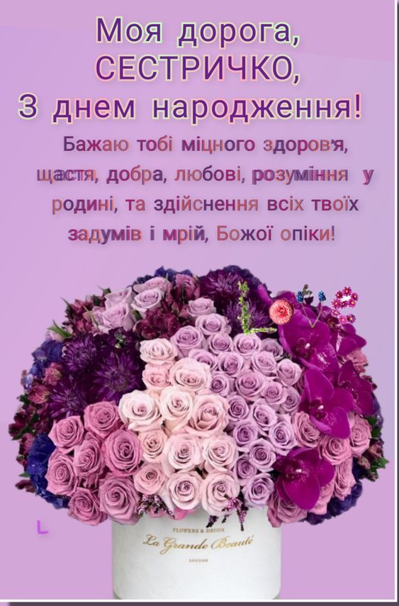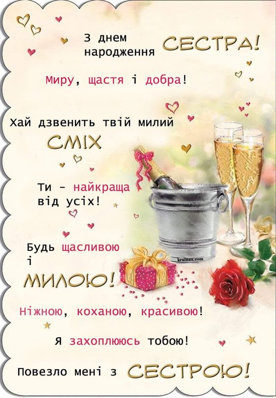 Вітаю, люба сестричко! Нехай життя буде легким, повним кохання і теплих моментів. Ти заслуговуєш на найкраще!