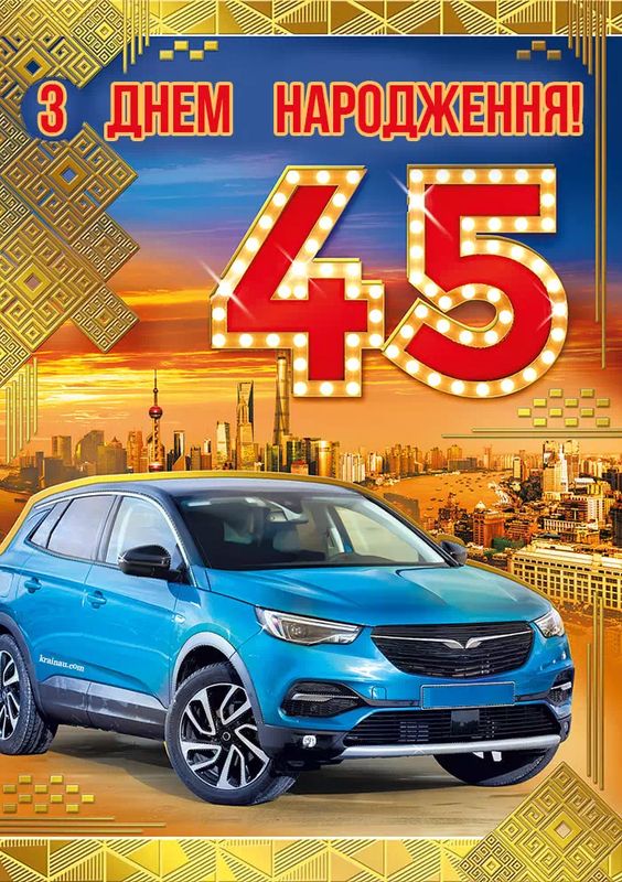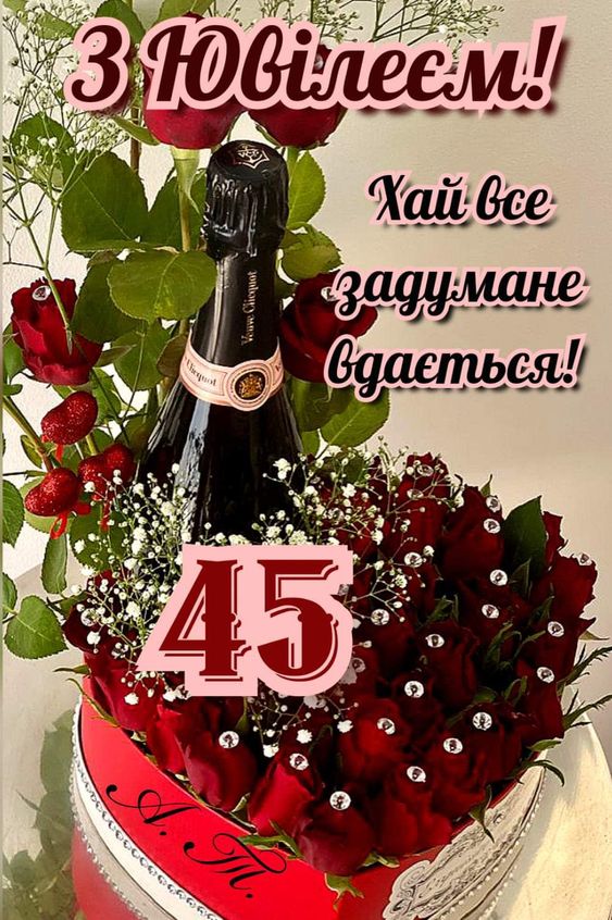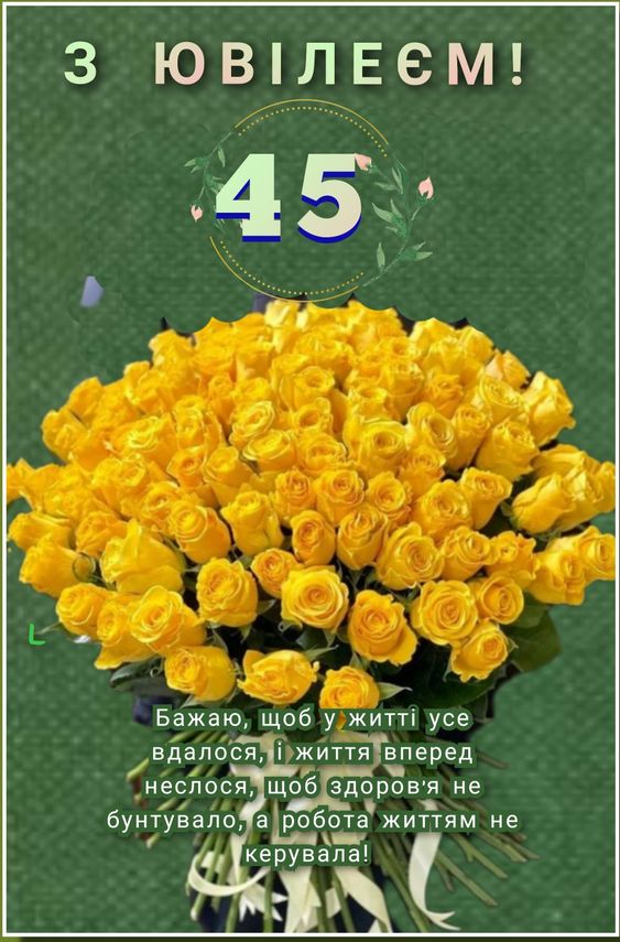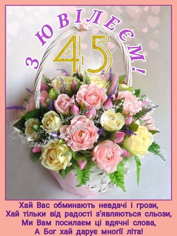 Вітаю з 45-річчям! Бажаю, щоб цей ювілей був повен щастя, радості і любові. Нехай твоє життя сяє новими барвами і приносить лише найкраще!