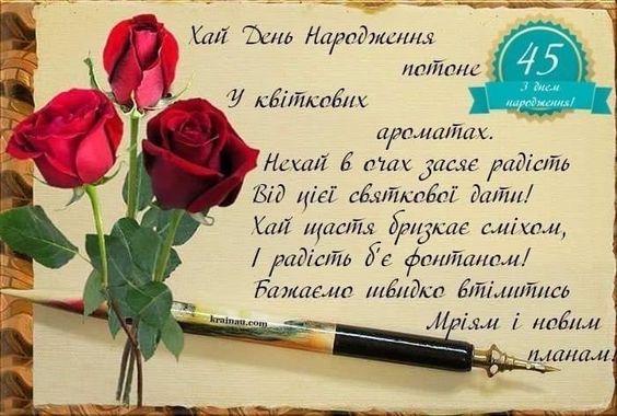 З 45-річчям! Нехай цей ювілей стане початком щасливого і світлого періоду в твоєму житті. Бажаю здоров’я, успіхів і багато гарних подій.