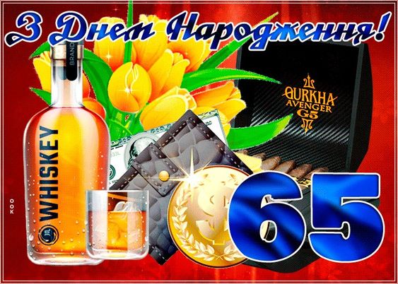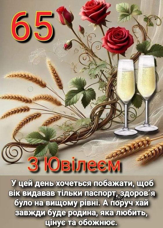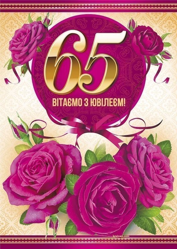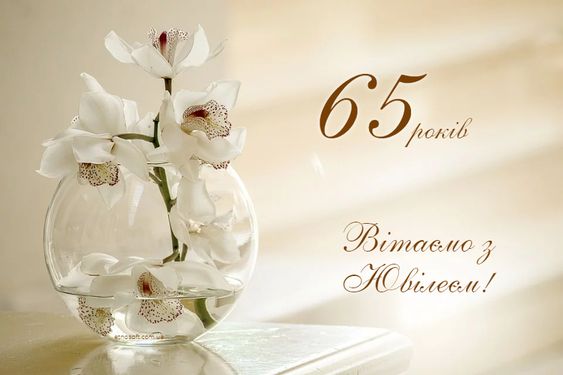 Вітаємо з 65-річним ювілеєм! Це прекрасна дата, яка символізує мудрість і багатий життєвий досвід. Бажаємо тобі здоров’я, благополуччя і багато щасливих моментів у житті.