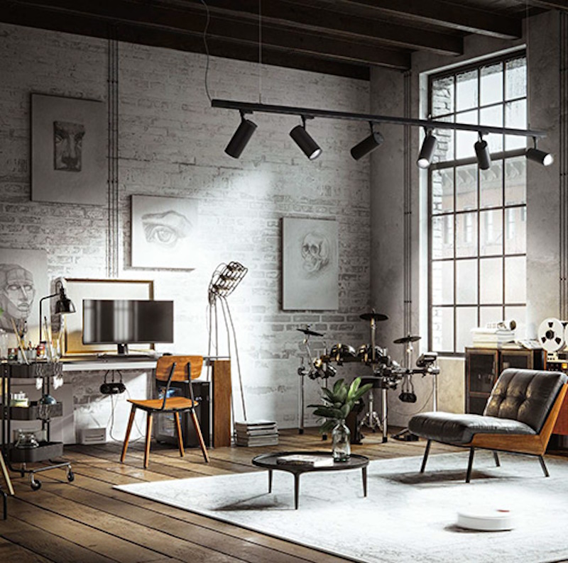 У стилі лофт трекові системи стають невід’ємною частиною індустріального шарму. Металеві рейки та лаконічні світильники підкреслюють атмосферу фабричного приміщення. Тут акцент робиться на чорні або темно-сірі елементи, які гармонують із цегляною кладкою та відкритими конструкціями.