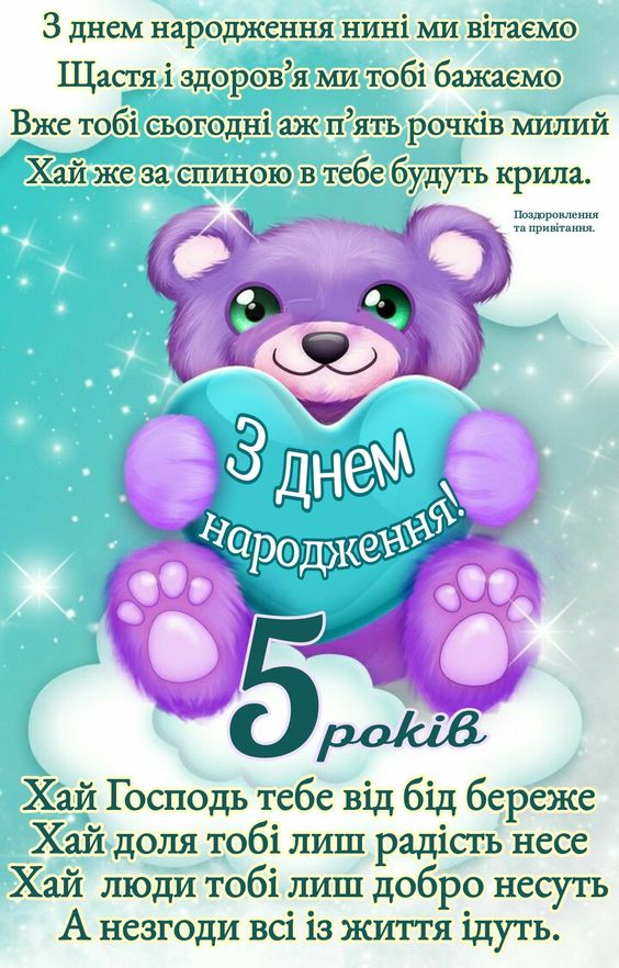 П’ять років — як маленьке чудо, Бажаємо радості і добра. Нехай усе в житті буде легко, А навколо — тепло і світло.
