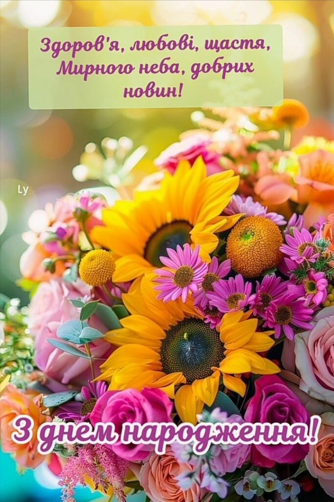 З днем народження! Нехай твоє життя буде як розквітлий сад, нехай у серці панує мир і радість, а всі мрії збуваються легко.