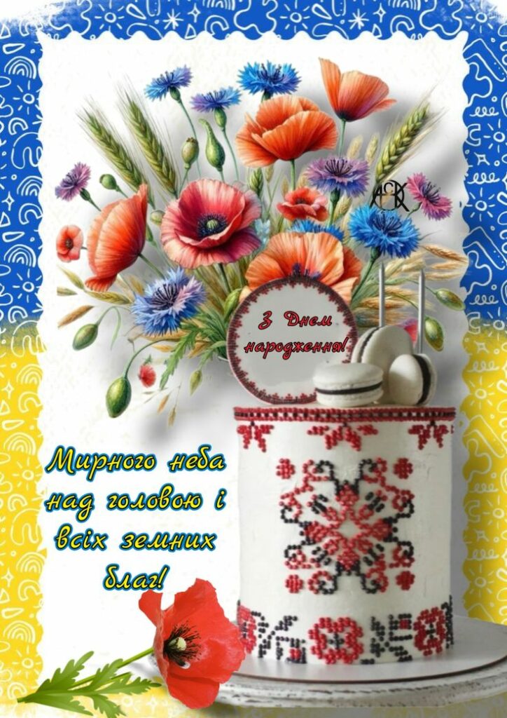 Іншим варіантом можуть бути зображення вишиванок або традиційного українського рушника, що символізує добробут і міцність родинних зв’язків. Також можна додати написи «З днем народження!» чи «Щиро вітаємо», оформлені в традиційному українському стилі, які надають листівкам особливого шарму.